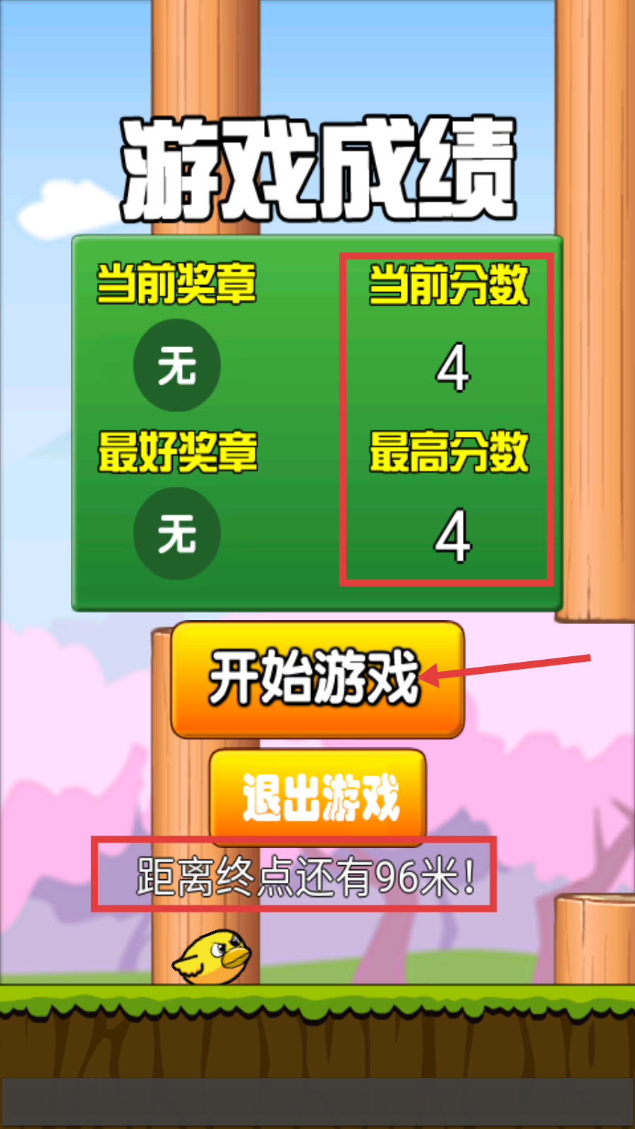 4、游戏结束后,查看【当前分数-4】和【最高分数-4】,点击【开始游戏】按钮,继续挑战以缩短【距离终点还有96米】的差距。