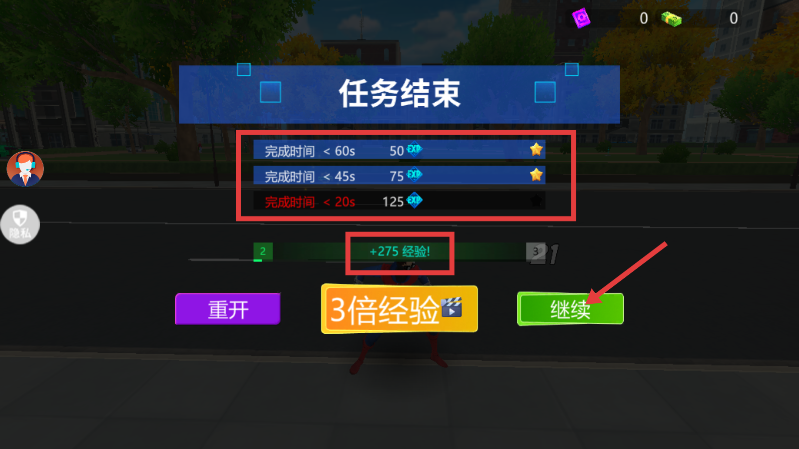 4、任务结束后,获得【+275经验】,根据完成时间获取对应奖励,点击【继续】按钮,开启下一个城市任务。