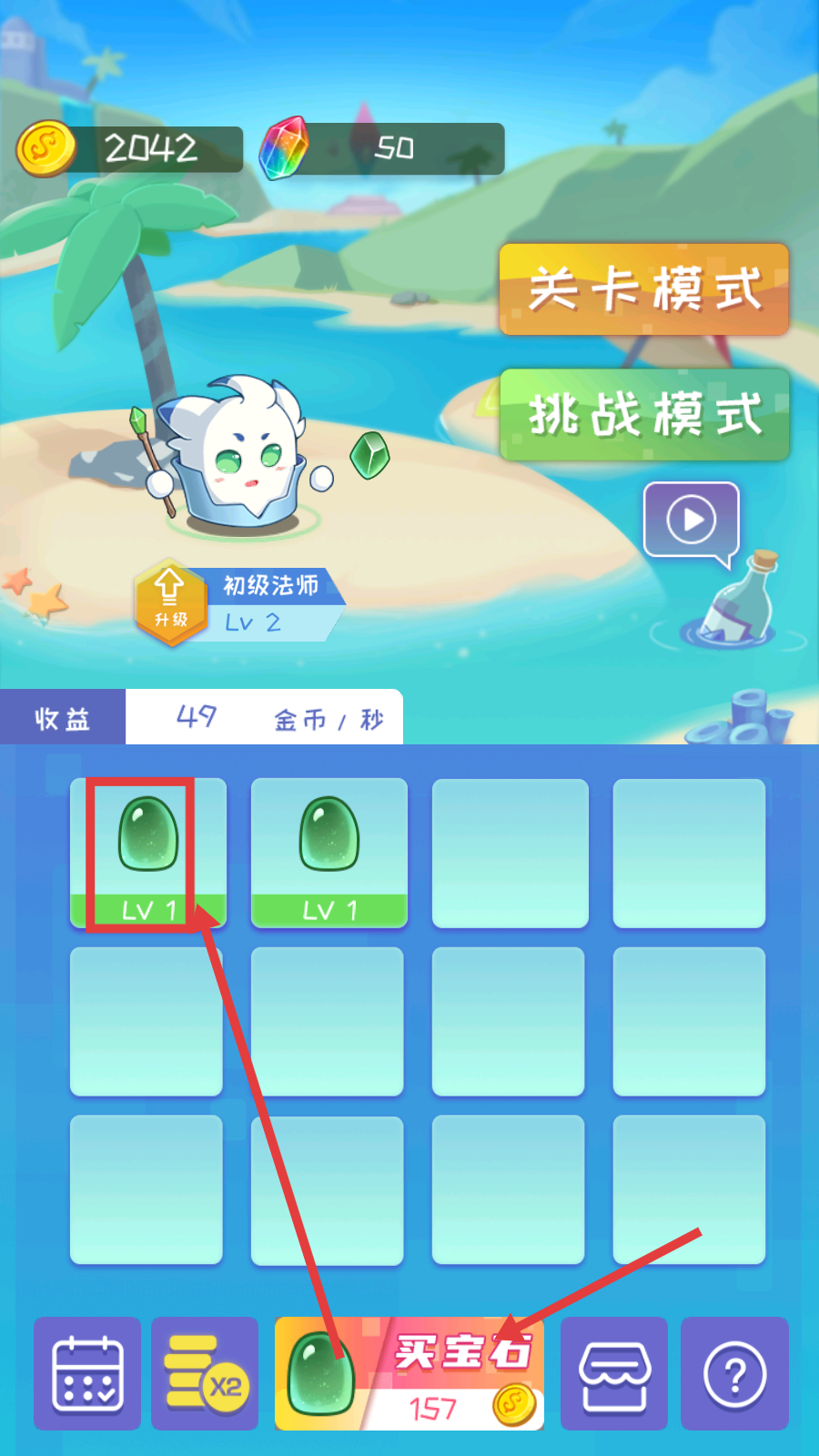 1、点击【买宝石】按钮,消耗金币购买宝石,提升【收益-49金币/秒】,为后续战斗积累资源。