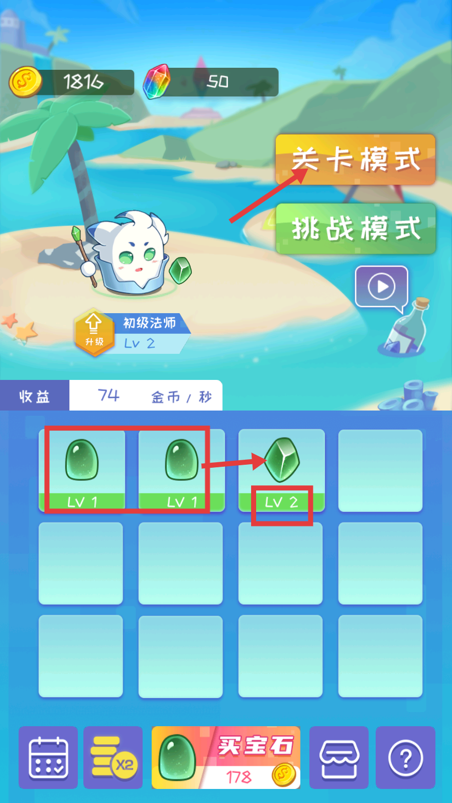 2、选择【关卡模式】,将相同等级的宝石合成升级,提升战力,为关卡挑战做好准备。