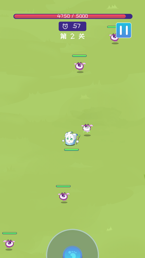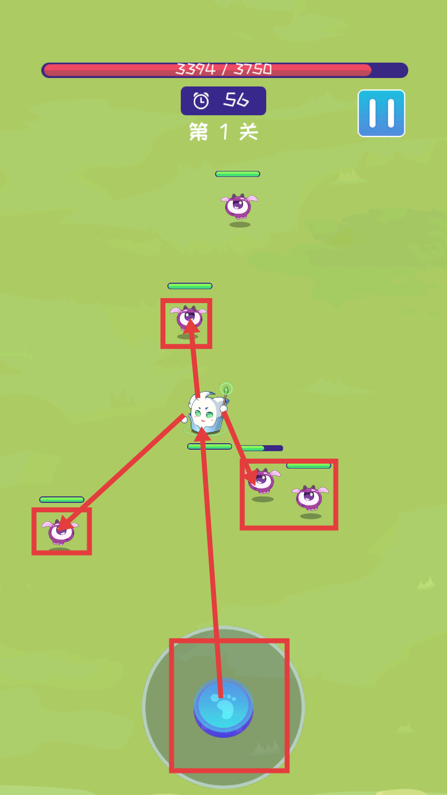 3、在第1关战斗中,控制角色攻击紫色怪物,注意【剩余时间-56秒】和关卡进度,高效清理敌人。