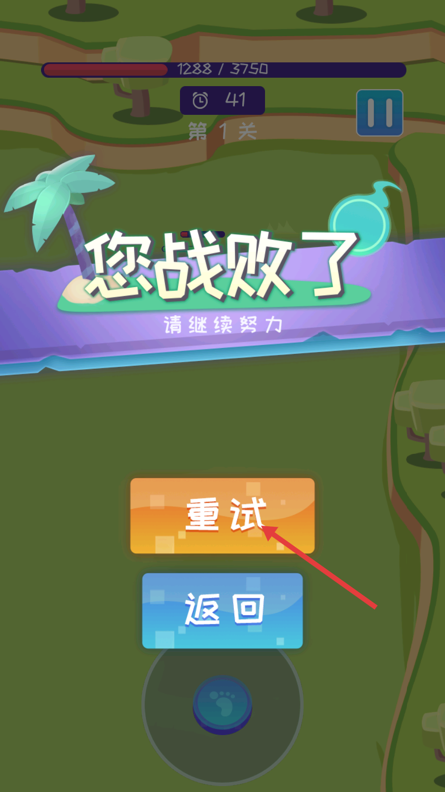 4、战败后点击【重试】按钮,重新挑战第1关,总结战斗经验,争取顺利通关。
