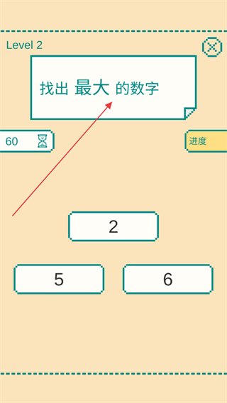 1、进入第2关,看清题目找出最大的数字,快速对比界面中的数字,如2、5、6,点击最大数字。