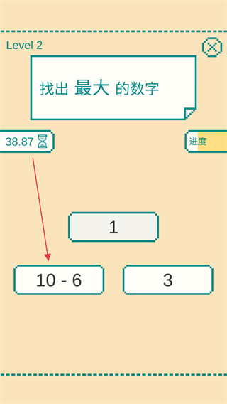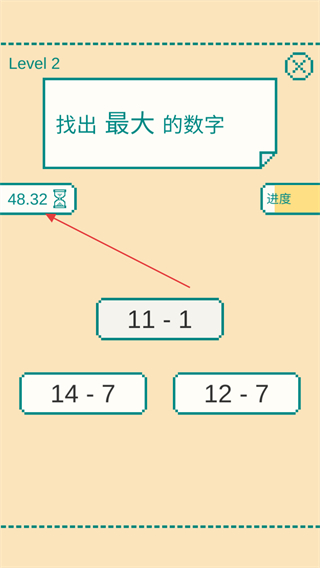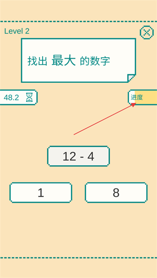 2、遇到算式形式的数字,像12-4,迅速心算出结果,再与其他数字比较,点击最大数字,同时留意进度条变化。