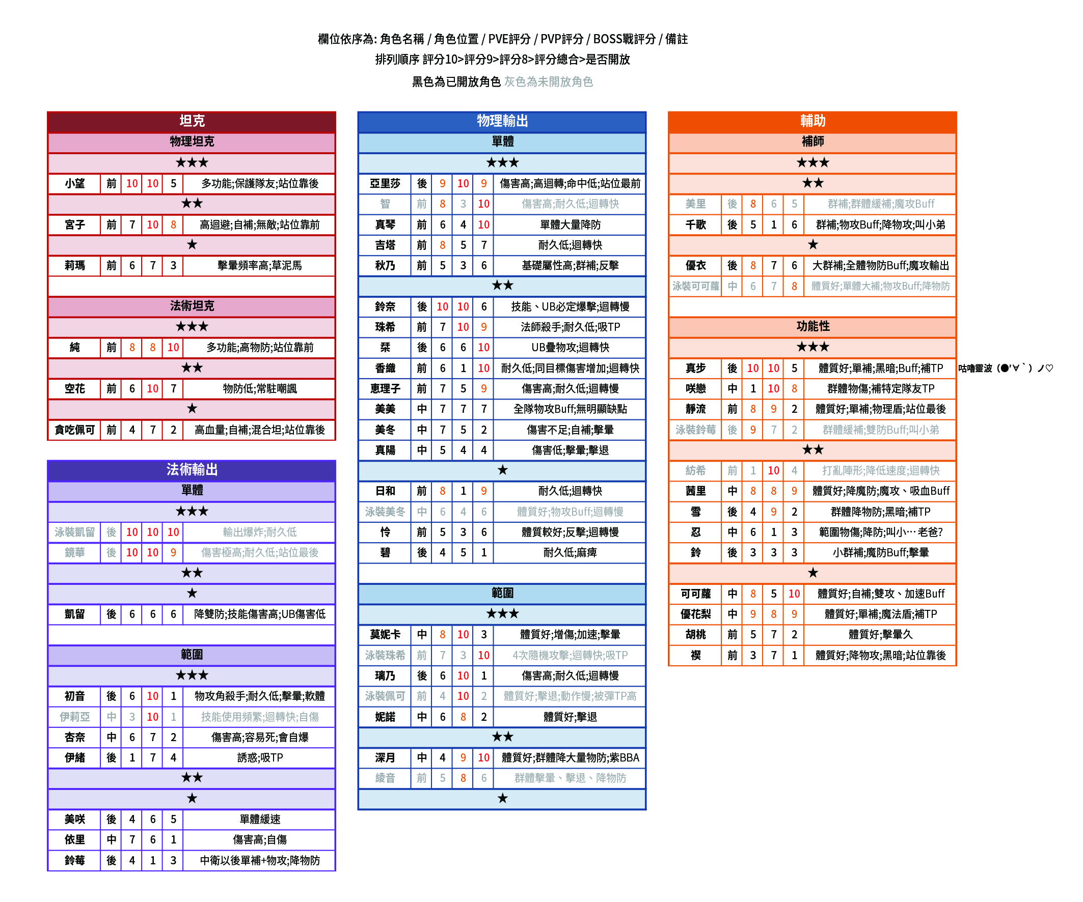 目前在游戏中,无论是推图、竞技场,前卫角色都是十分重要。输出角色可以以2星角色代替,但目前除了部分个别例子外(例如2星布丁),2星跟3星前卫的性能差距是非常巨大的。