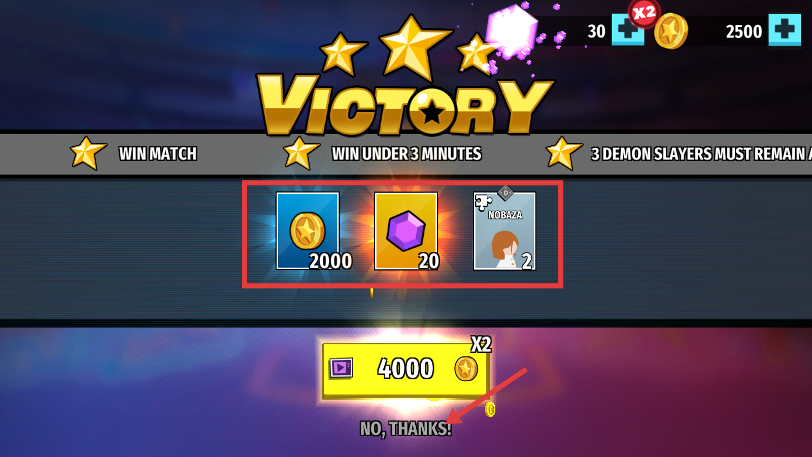 4、通关后获得【金币-2000】、【紫色宝石-20】等奖励,可选择【NO,-THANKS!】或观看广告翻倍奖励,积累资源提升战力。