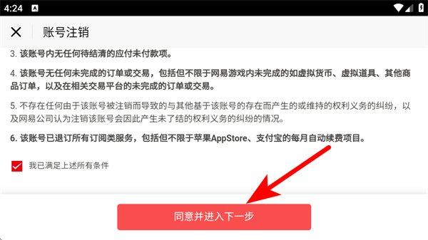 3、在注销条件确认页面,勾选满足条件后点击同意并进入下一步。