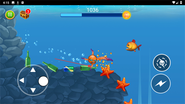 2、遇到小鱼等游动的目标时,灵活运用左侧虚拟摇杆,调整位置进行吞噬,增加分数。