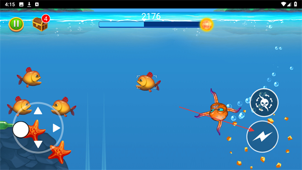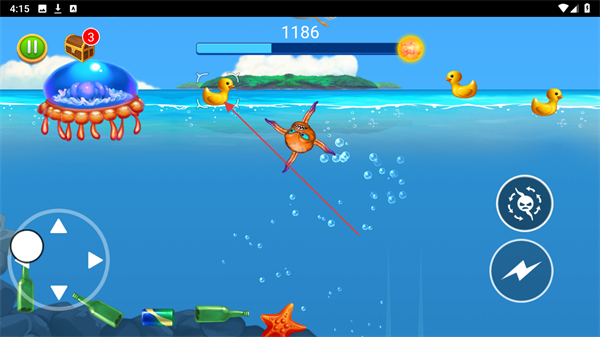 1、操控八爪鱼移动,在海底场景中寻找可吞噬的目标,如瓶子、海星等,快速提升进度条数值。