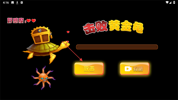 4、遇到BOSS如黄金龟,通过点击攻击按钮进行战斗,若好感度足够,还可尝试投喂来达成不同的结果,持续游戏以获取更高分数。