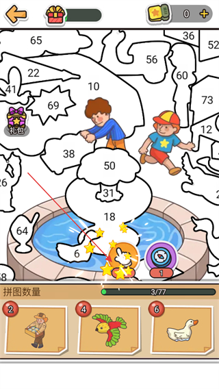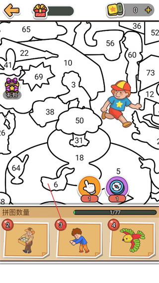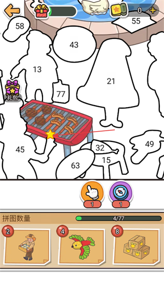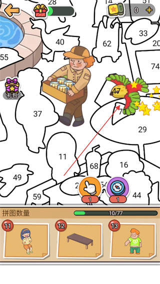 1、进入游戏界面,查看拼图数量及进度条如1/77,点击下方的拼图碎片。