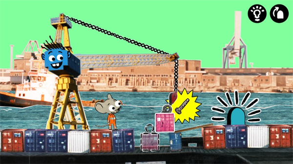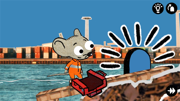 2.开始挑战通关与老鼠的好友默契配合,使用钩子勾住箱子摆放到正确的位置中,帮助老鼠顺利到达洞口,收集工具零件通关。