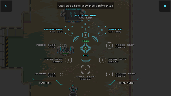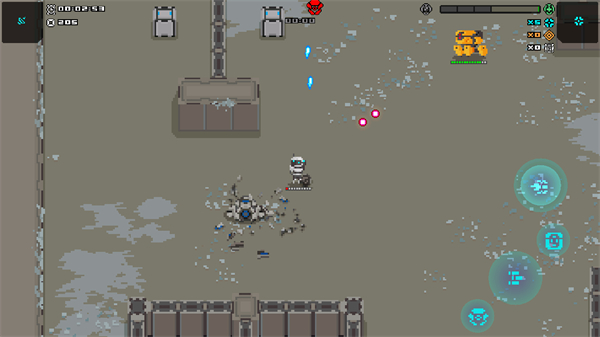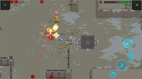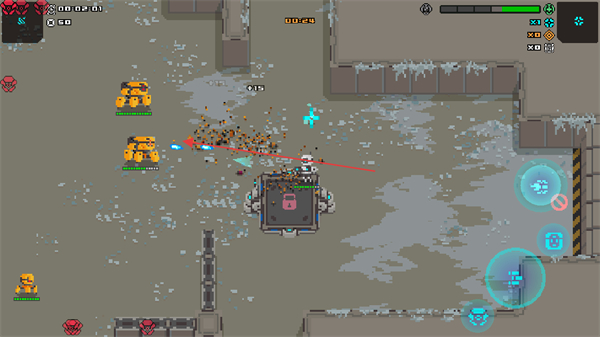 2D像素画面还原复古街机质感,工业风战场与机甲设计相得益彰,搭配射击时的像素粒子特效,营造出硬核又怀旧的战斗氛围。