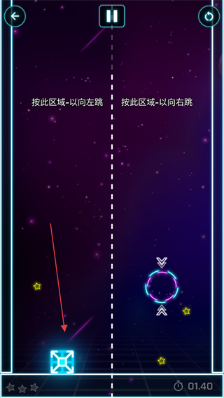 1、游戏界面下方左侧区域点击可让方块向左跳,按提示操作练习基本移动。
