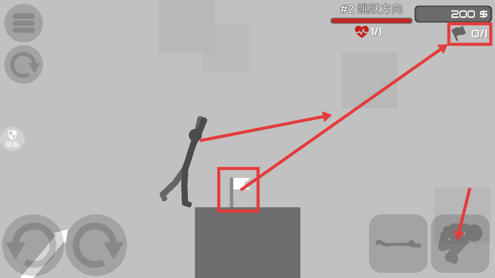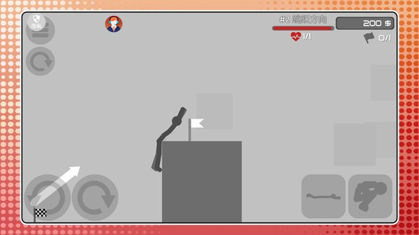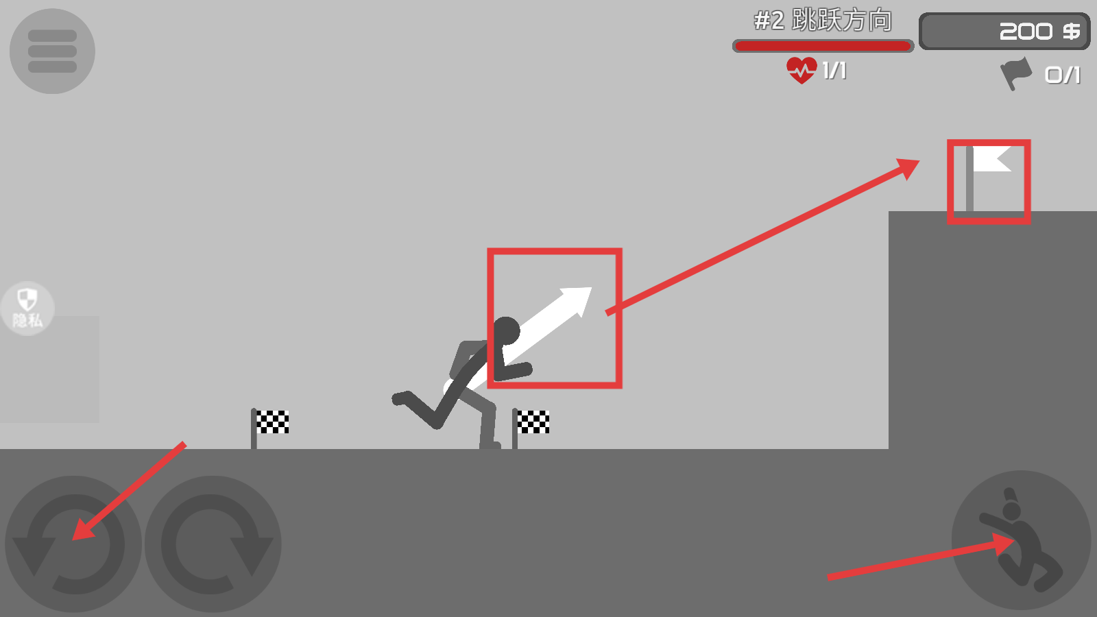 2、在【#2-跳跃方向】关卡中,操控角色按照箭头方向跳跃,目标是上方的旗帜,注意操作时机。
