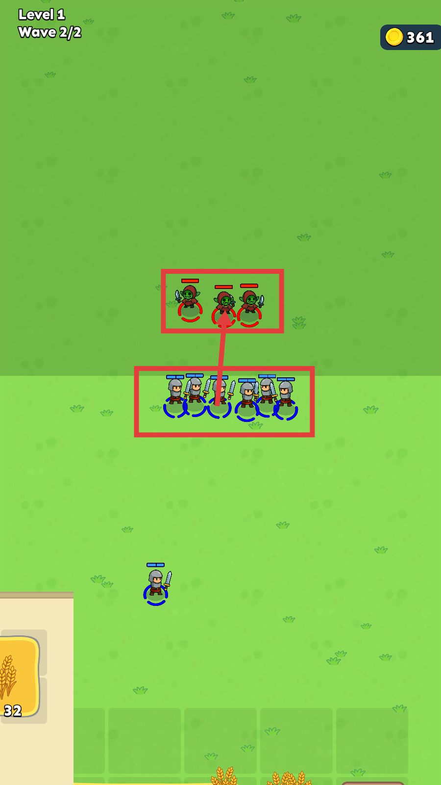1、在【Level-1-Wave-1/2】阶段,布置小麦和建筑,积累金币,为后续战斗的士兵招募与建筑升级做准备。