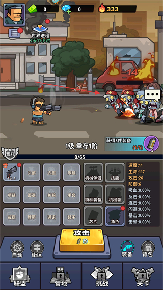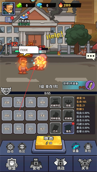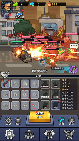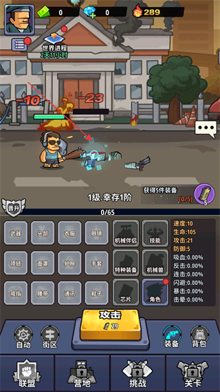 2、持续点击攻击按钮,消灭敌人,获取经验和装备,提升自身属性。