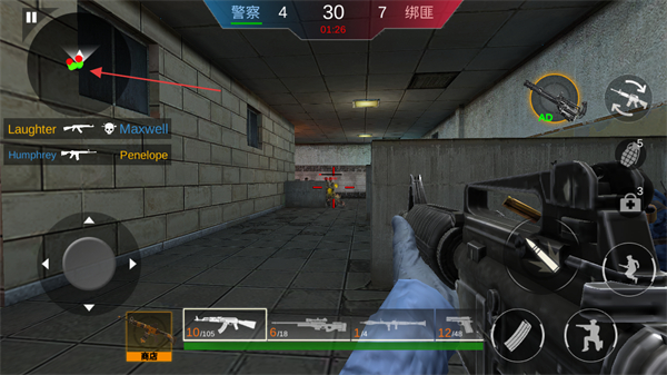 4、留意小地图左上角,掌握敌人位置,持续战斗,帮助己方阵营警察获取胜利。