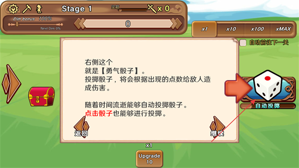 1、进入游戏界面,了解Stage1的基本操作,右侧勇气骰子可点击投掷,也能随时间自动投掷对敌人造成伤害。