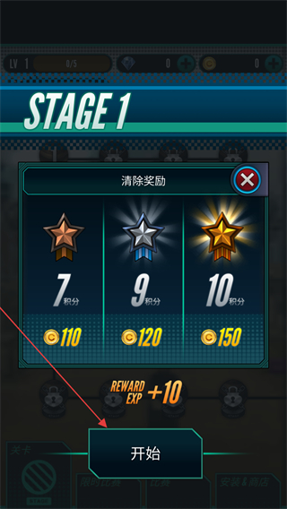 1、在关卡选择界面,查看STAGE1的清除奖励,点击开始进入游戏。