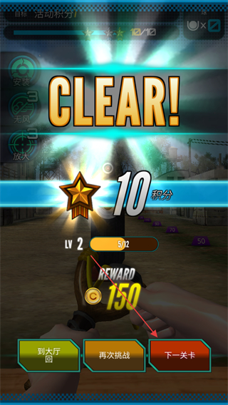 4、完成关卡后,若显示CLEAR!,根据积分获得奖励,点击下一关卡挑战新关卡。