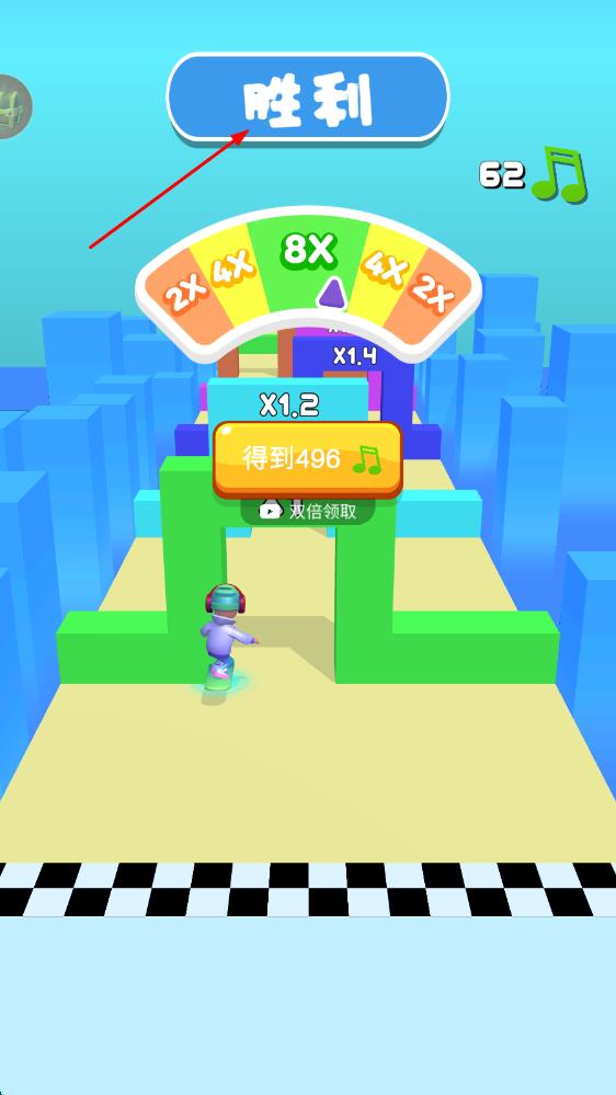 2、游戏中途,需紧盯赛道上的障碍物,根据音乐节拍及时调整方向与动作,遇到道具时及时拾取,利用道具加快闯关速度,突破关卡难点。