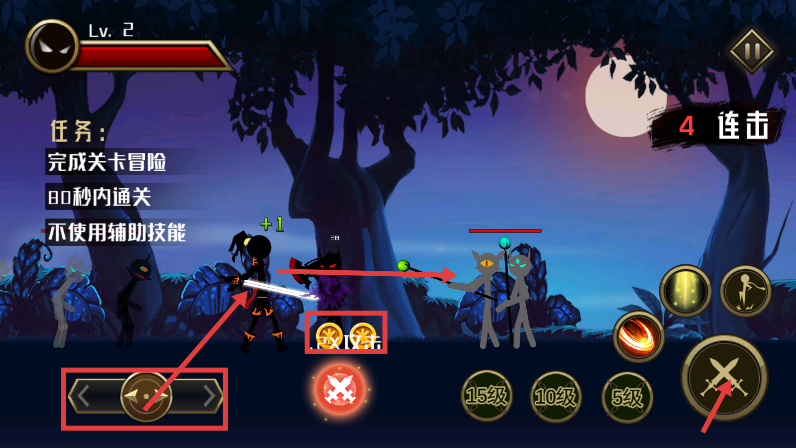 2、战斗时操控移动按钮走位,点击攻击按钮连击敌人,完成【关卡冒险-80秒内通关-不使用辅助技能】的任务目标。