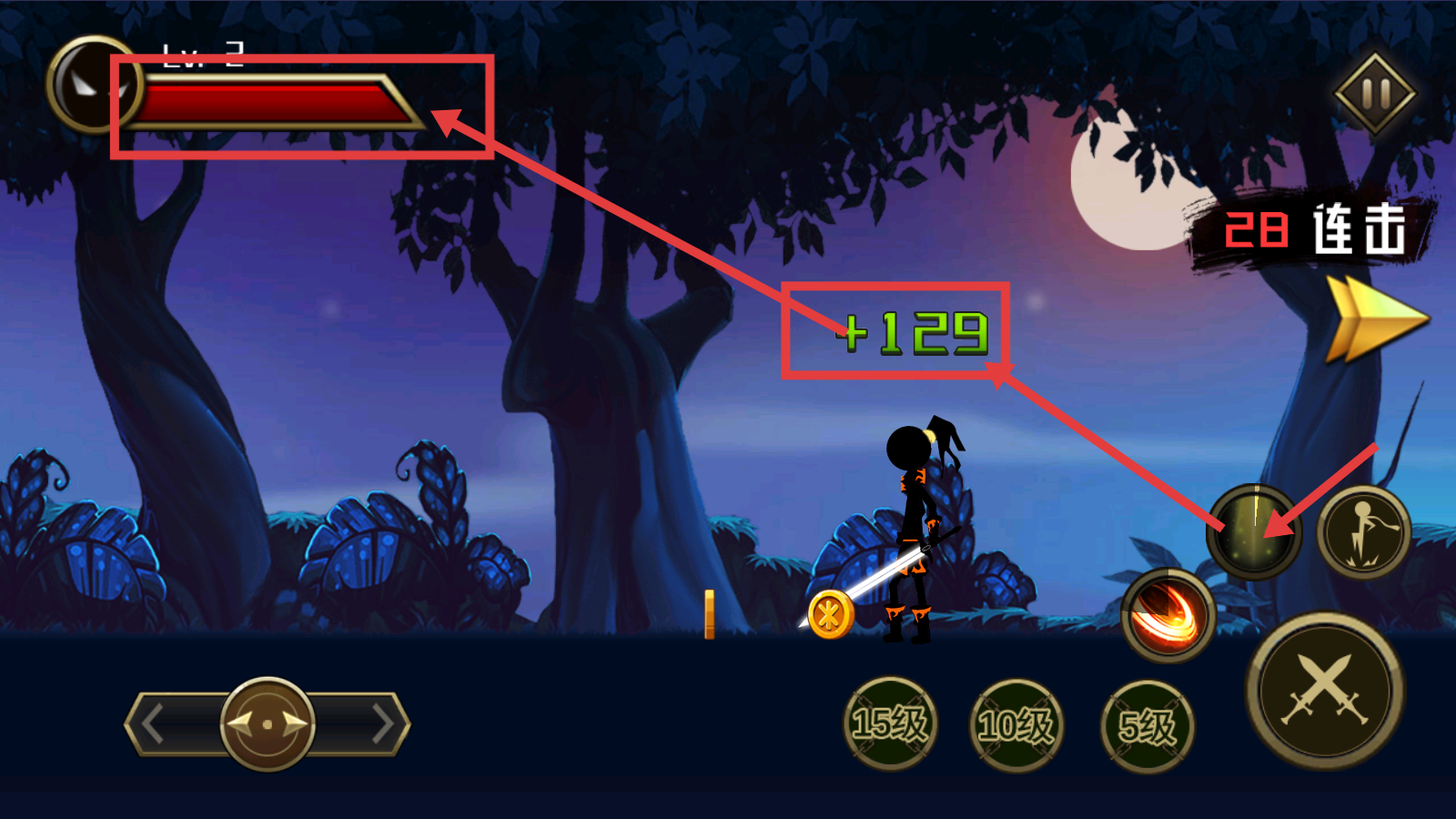 3、战斗中关注敌人血量,通过连击获取【+129】经验,合理操作提升战斗效率以积累经验。
