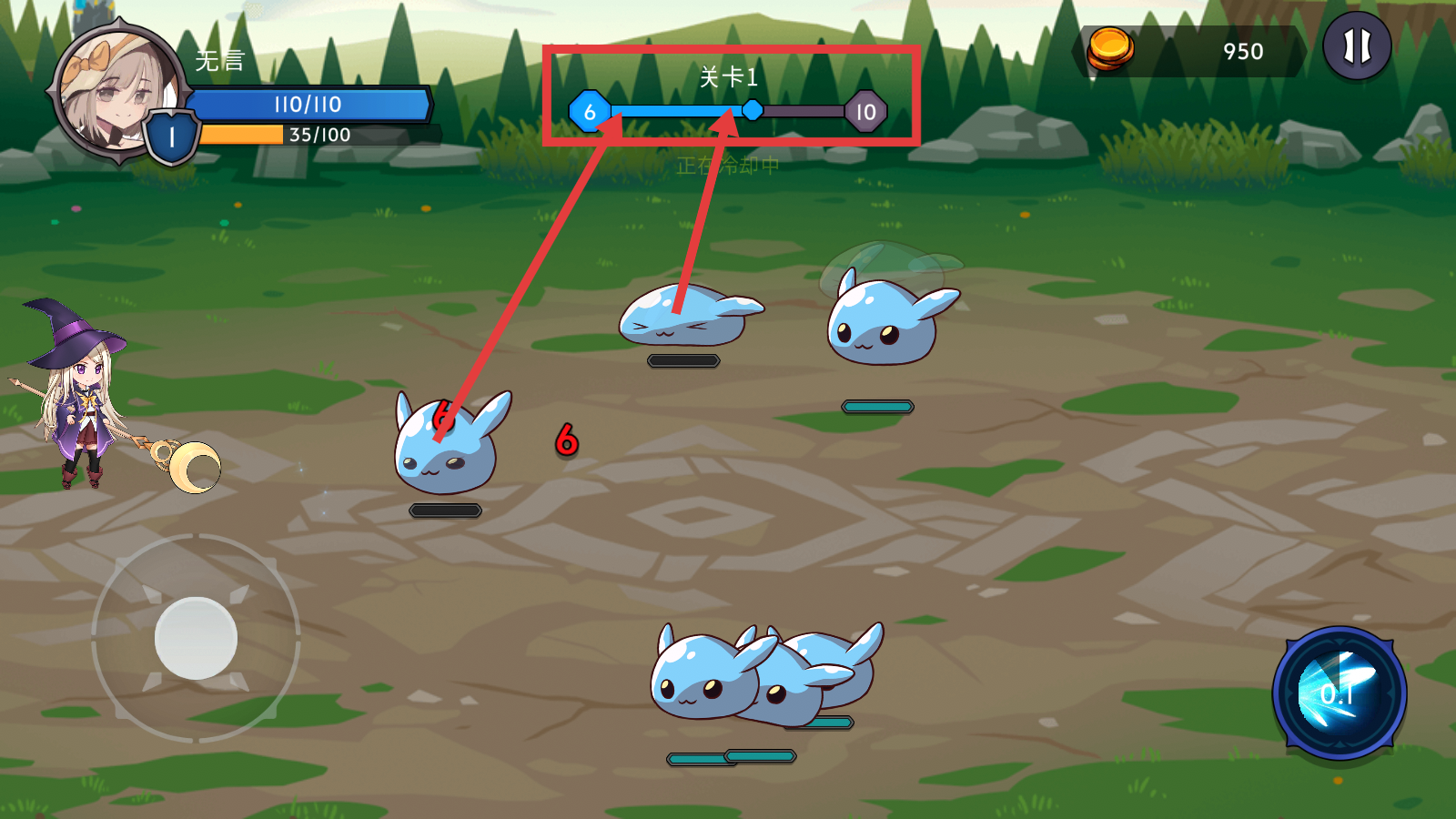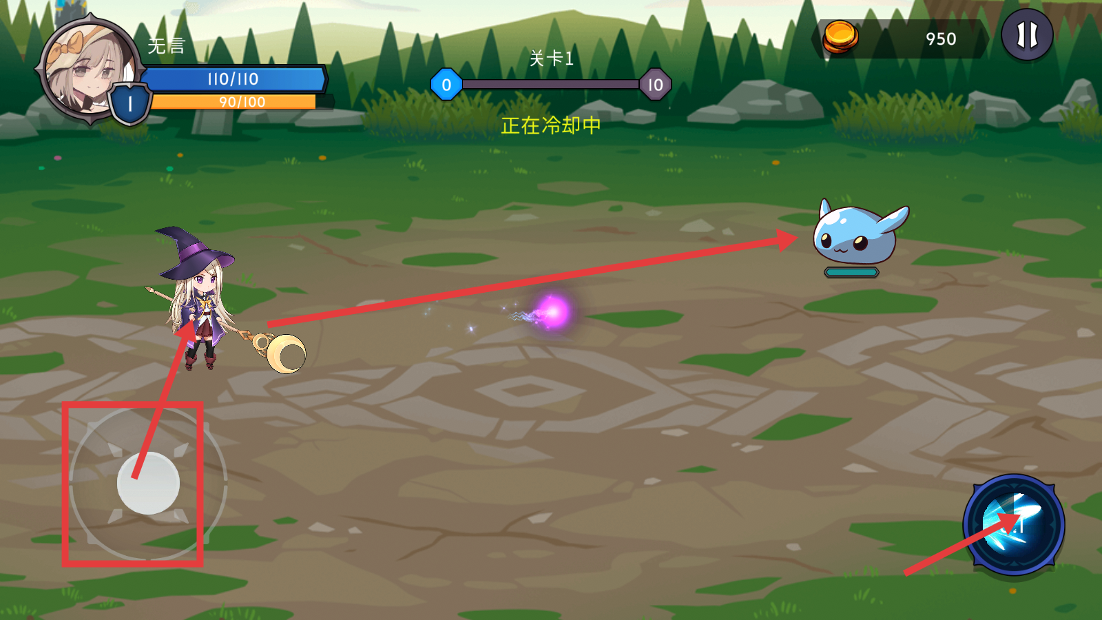 2、战斗时通过左下角移动按钮操控角色,释放技能攻击如蓝色史莱姆的敌人,留意技能冷却状态,灵活走位作战。