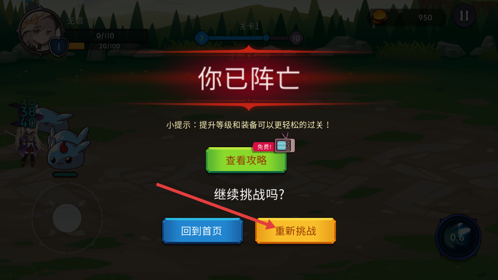 4、若阵亡,可点击【重新挑战】按钮再次尝试,提升等级和装备能更轻松过关,也可查看攻略获取通关技巧。