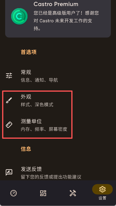 3、进入设置菜单可以调整软件的外观和单位等参数。