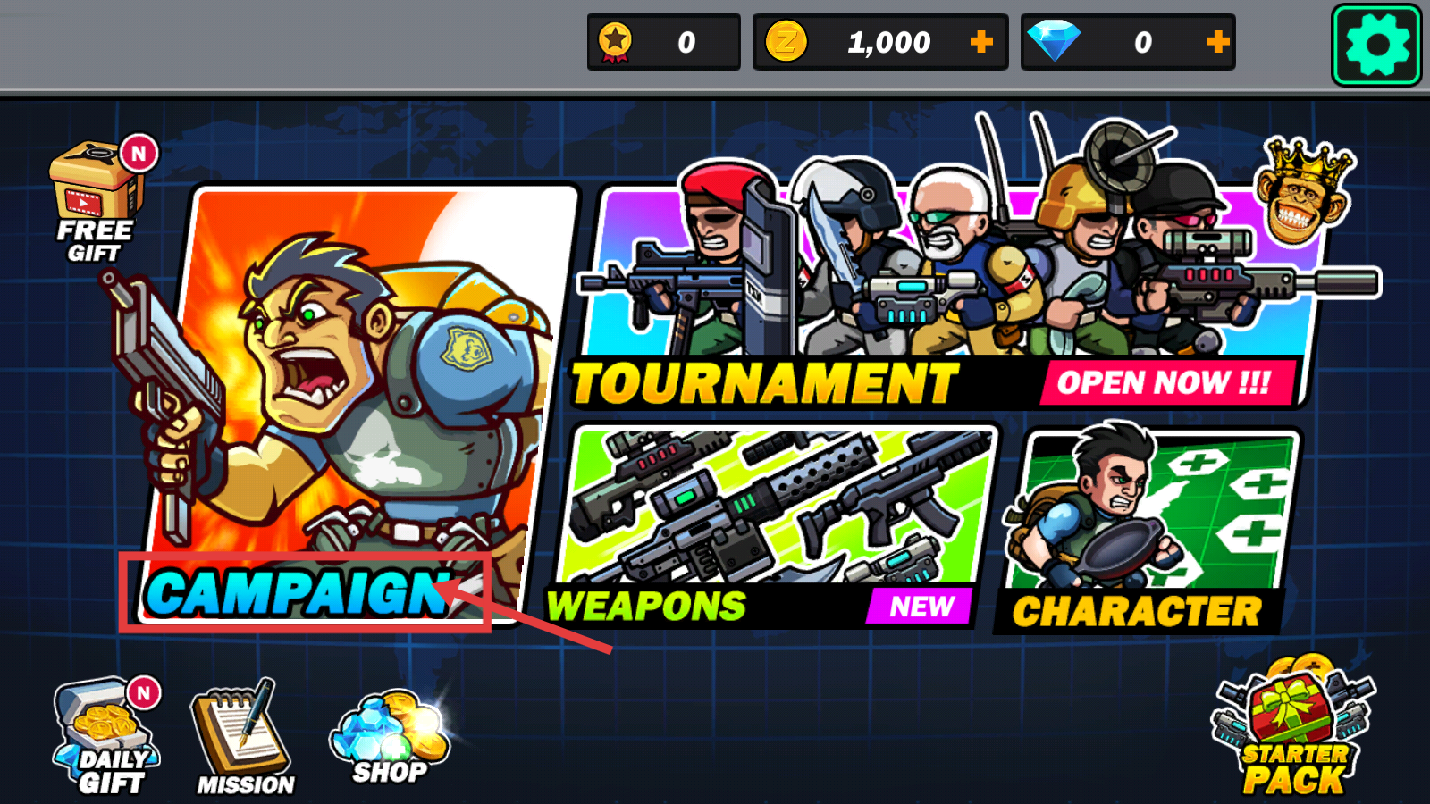 1、进入游戏界面后,点击【CAMPAIGN】开始战役模式,可先查看【WEAPONS】【CHARACTER】等功能,为战斗做准备。