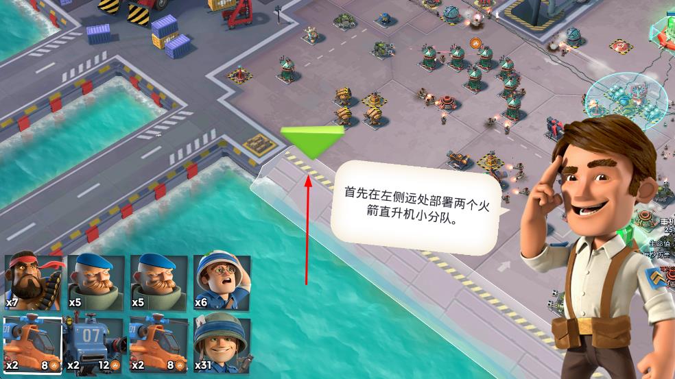 3、进入游戏后,根据提示,在左侧远处部署两个火箭直升机小分队,参与战斗。
