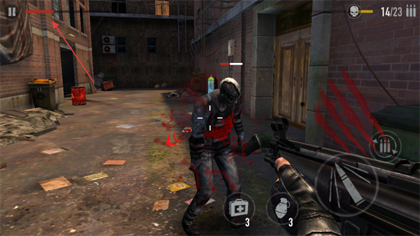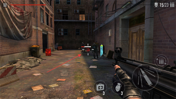 1、进入游戏场景,留意右上角僵尸剩余数量显示15/23,滑动屏幕寻找僵尸,瞄准射击。