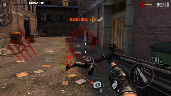 3、成功击中僵尸,出现HEADKILL+10提示时,可获得额外奖励,血量低时点击医疗包图标回血。