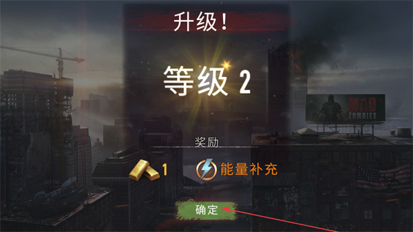 4、完成关卡任务,达到升级条件后,出现升级!等级2提示,点击确定领取奖励,提升角色能力。