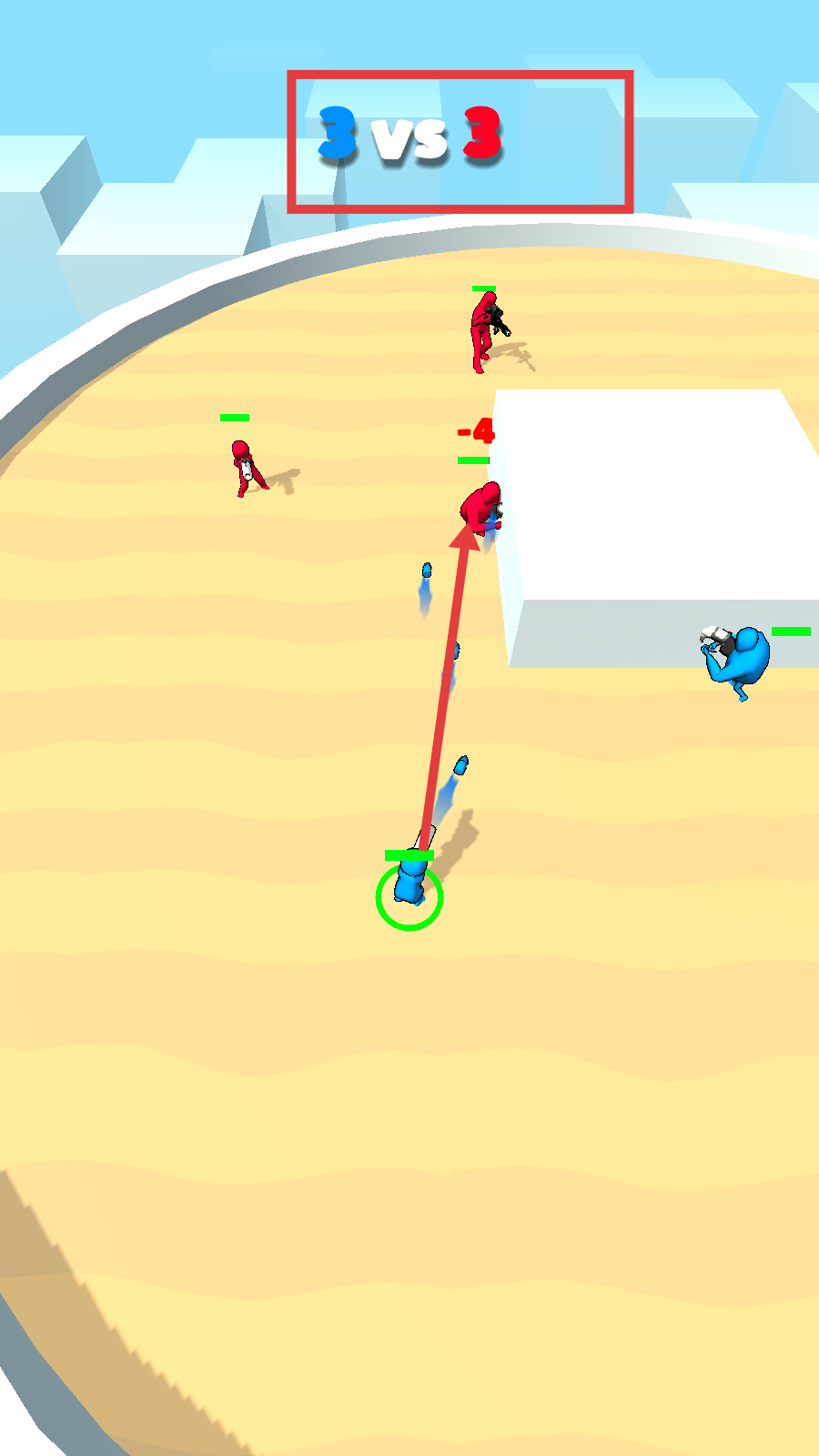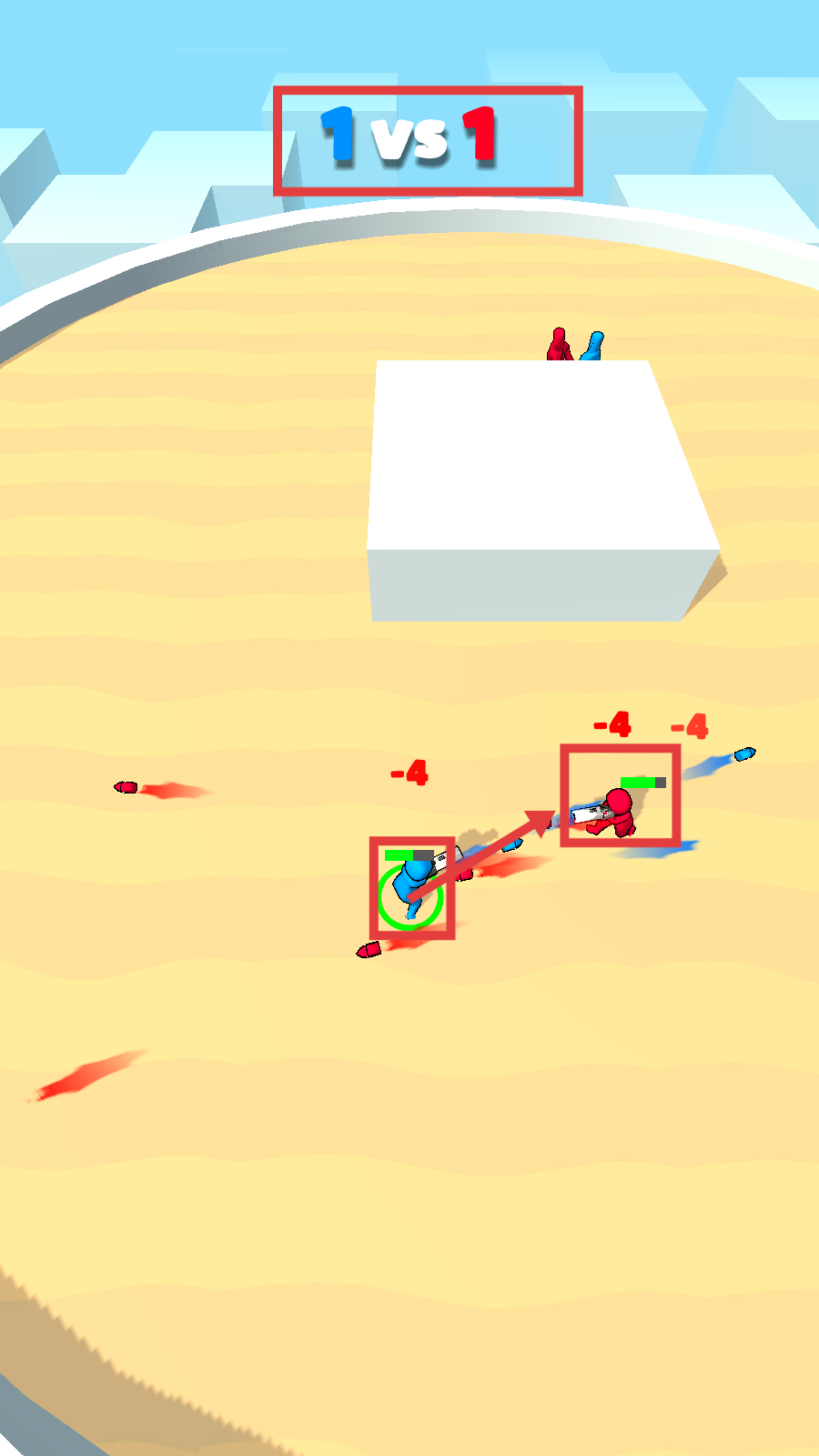3、进入【1-vs-1】对决,专注攻击单个红色敌人,把握攻击节奏,避免被击中,争取快速取胜。