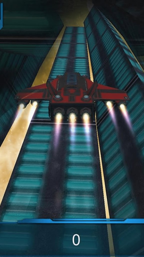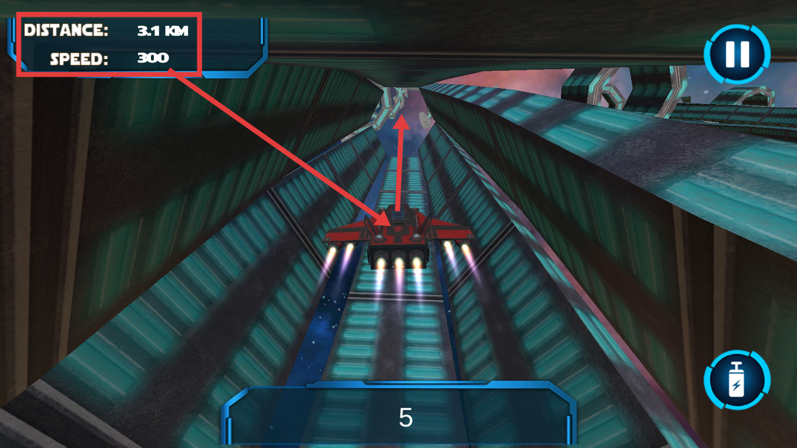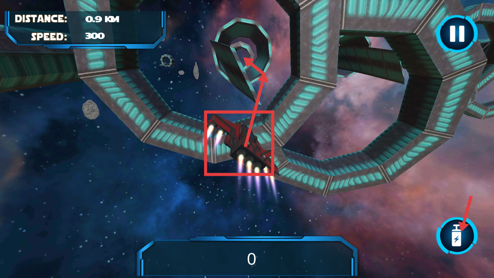 3、关注左上角【DISTANCE-3.1-KM】【SPEED-300】数据,保持飞船沿路径飞行,精准通过狭窄通道以延长飞行距离。