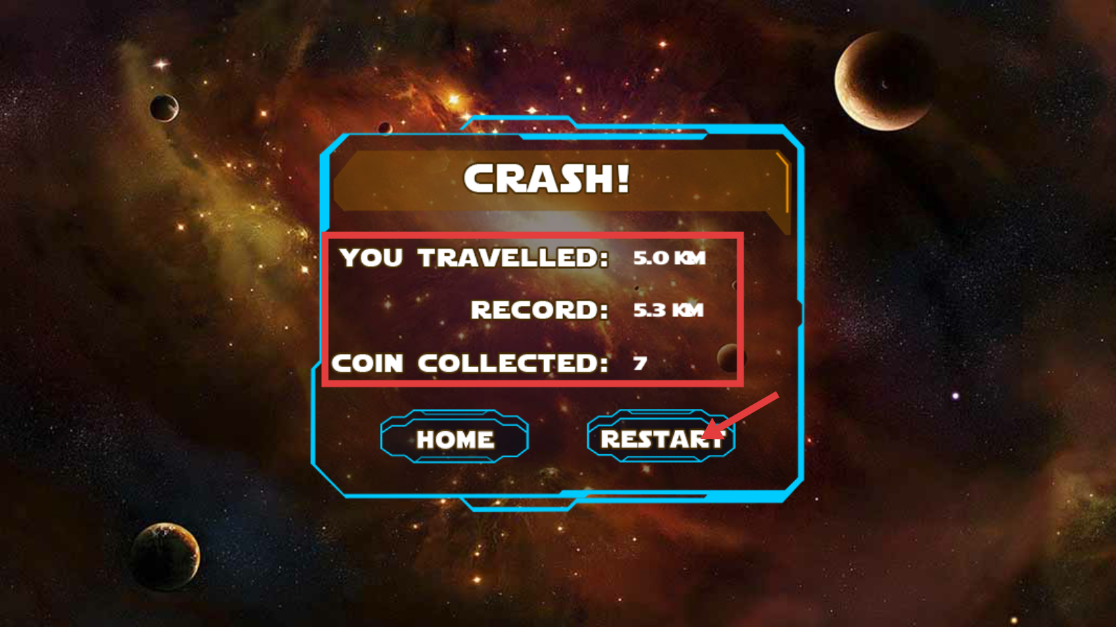 4、若飞船坠毁,查看飞行距离【5.0-KM】和金币【7】,点击【RESTART】重新挑战,争取突破记录。