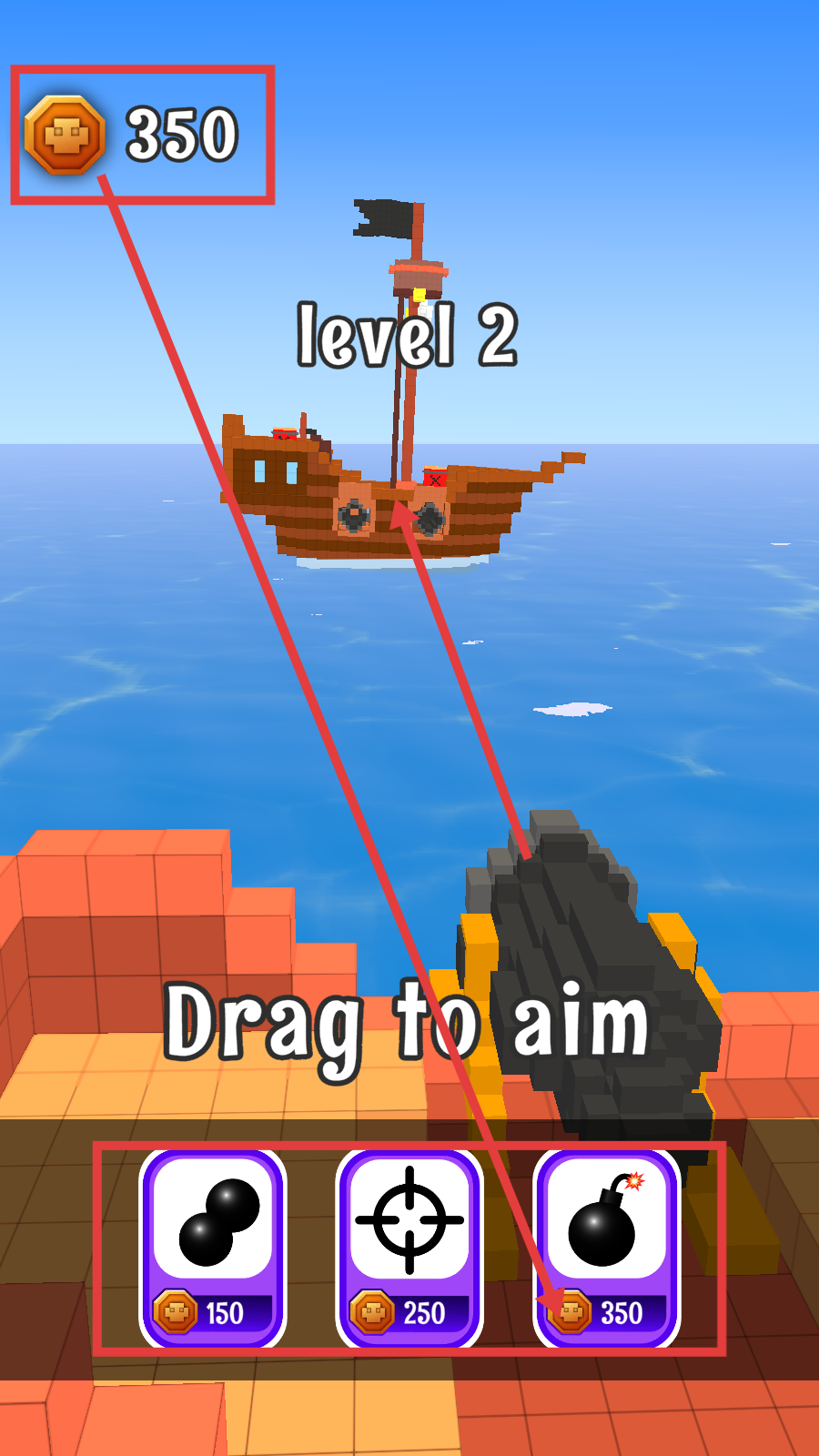 2、进入【level-2】,利用【350】金币选择炸弹道具,拖动瞄准敌方船只,准备发起攻击。