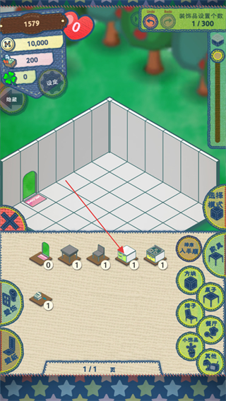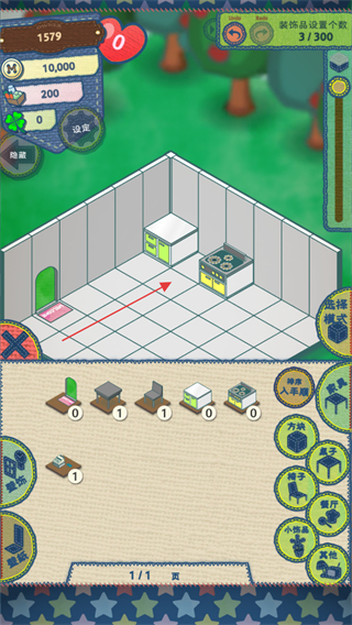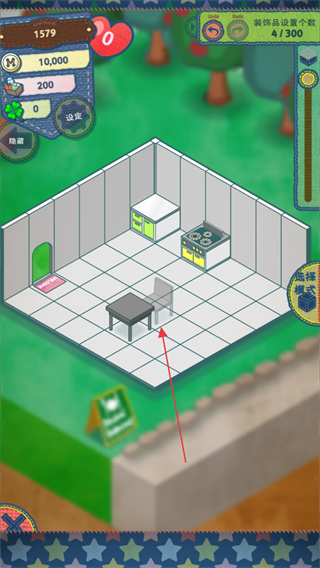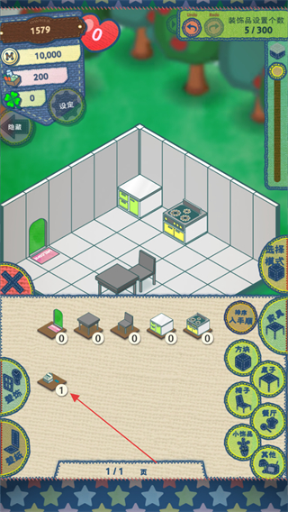 1、进入游戏,查看左上角资源数量,点击下方物品栏选中家具,准备布置餐厅。