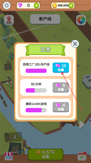 4、点击右下角任务图标,查看任务列表,完成相应任务后点击收集,领取钻石等奖励。