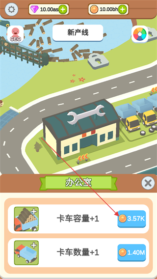 3、点击办公室,使用金币购买卡车容量+1或卡车数量+1,提升运输能力。