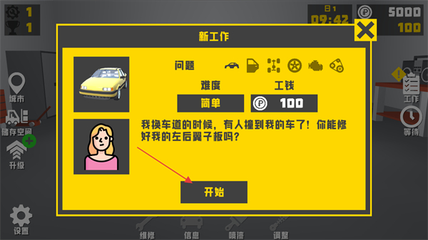 1、在游戏界面看到新工作提示,了解任务是修理左后翼子板,难度简单,工钱100,点击开始。