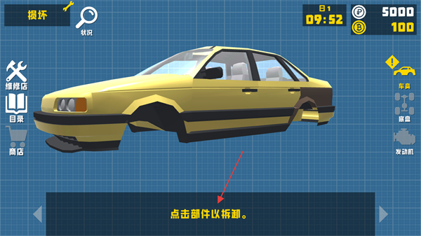 2、进入修理界面,根据提示点击部件以拆卸,找到损坏的左后翼子板部件并点击拆卸。