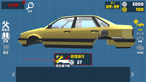 3、拆卸后,点击出现的修理部件后左翼子板按钮,花费对应费用进行修理操作。