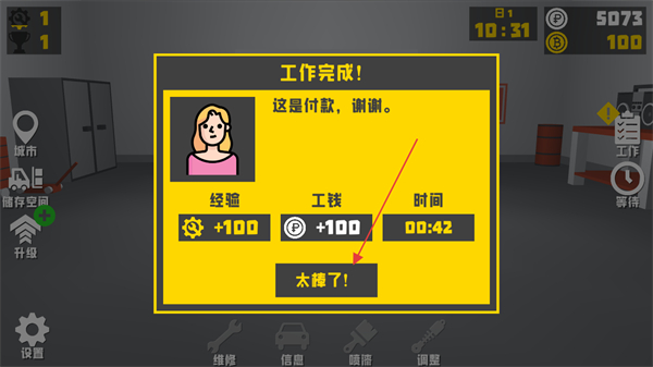 4、完成修理,出现工作完成!提示,查看获得的经验和工钱,点击太棒了!接收报酬并继续下一个工作。