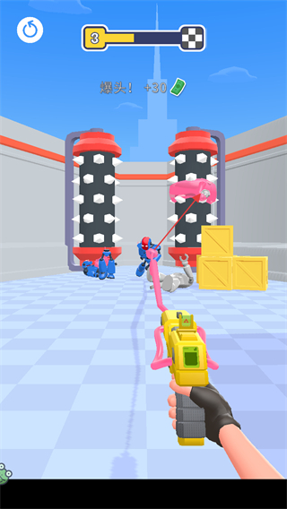 3、利用场景中的机关,比如带刺的柱子等,引诱敌人靠近机关,借助机关对敌人造成伤害,若成功击中敌人头部,会出现爆头!+30的得分提示。
