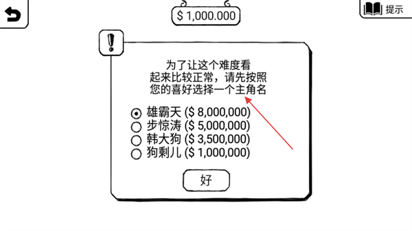 1、看到选择主角名提示,根据资金情况,如选狗剩儿,点击对应选项后点好确认。