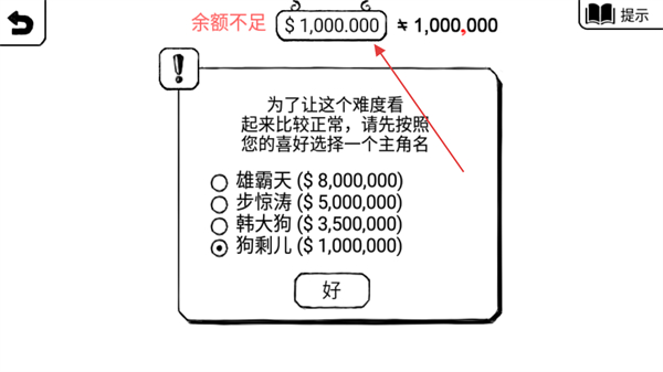 2、若出现余额不足提示,重新审视资金和主角价格,选符合预算的主角。